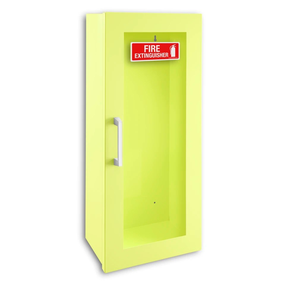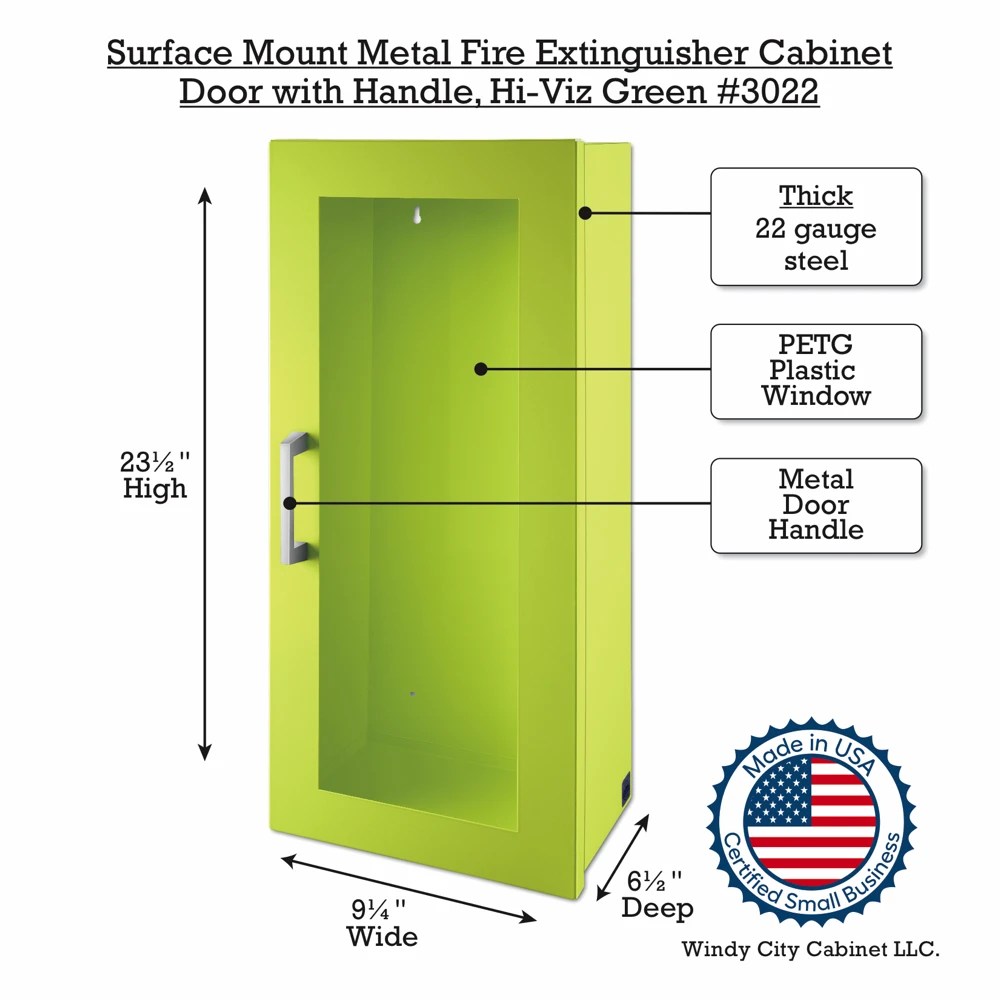 Surface Mount Fire Extinguisher Cabinet, Door with Handle in High Visibility Green Details